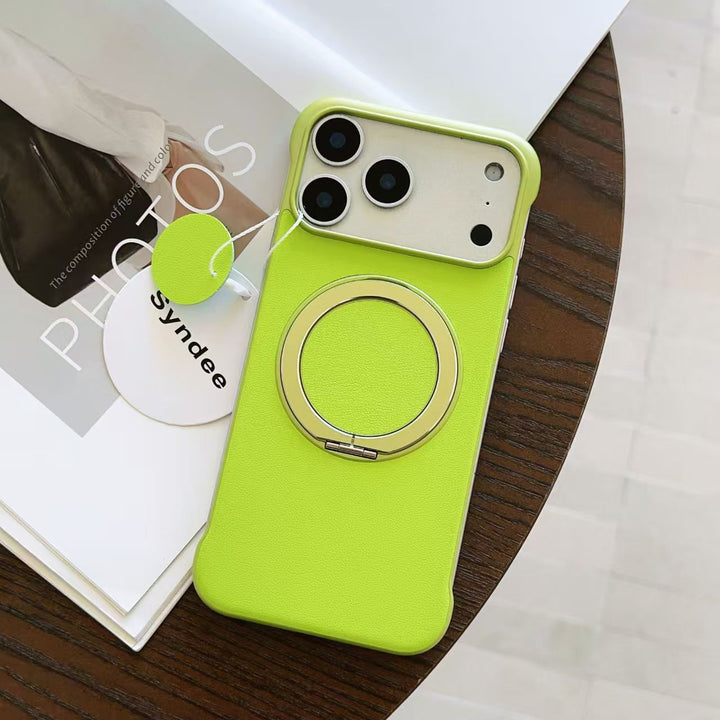 Featuring a leather-textured back panel and contrasting borders, this bright orange color scheme creates a luxurious look while maintaining a comfortable feel and stylish appearance. It integrates the MagSafe magnetic module with a rotatable metal stand, supporting both wireless charging and versatile use in various scenarios.